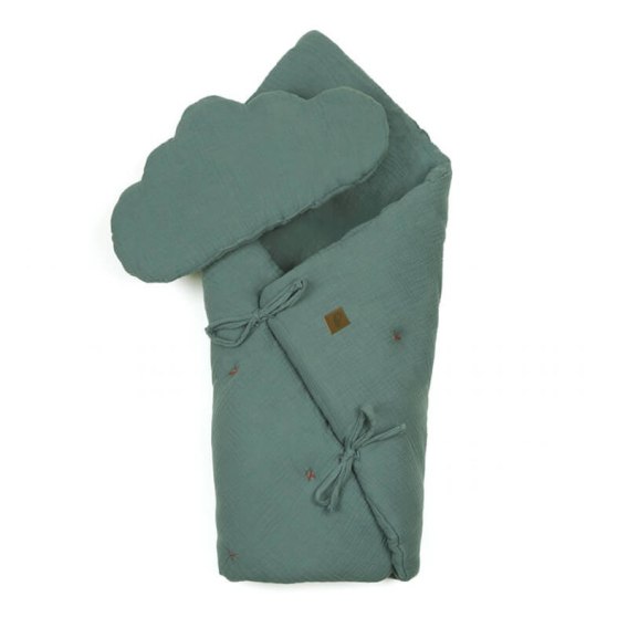Przepiękna oddychająca kołderka muślinowa z podusią, którą dzięki specjalnie wszytym troczkom możesz łatwo związać i otrzymujesz rożek niemowlęcy.