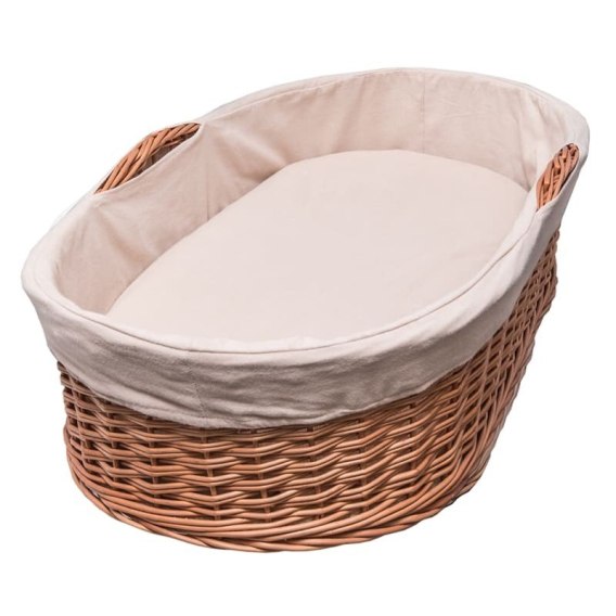Niski kosz Mojżesza z organicznej wikliny z wodoodpornym materacykiem i ochraniaczem.