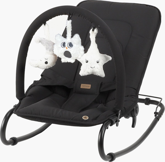 Leżaczek został wyposażony w pałąk z przyczepionymi szeleszczącymi zabawkami.
