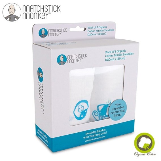 Organiczny otulacz Matchstick Monkey Organic Cotton Swaddle Blue z organicznej BIO bawełny z silikonową mini wstawką gryzakową dla Niemowląt.