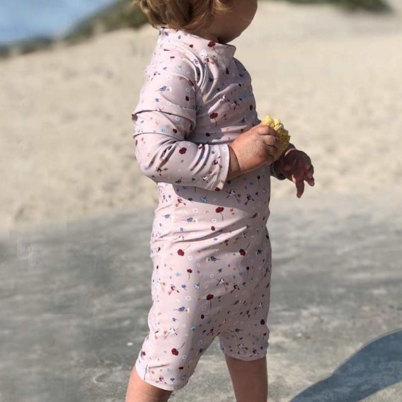 Kombinezon kąpielowy z ochroną przeciwsłoneczną skóry dziecka o współczynniku UV 50+.